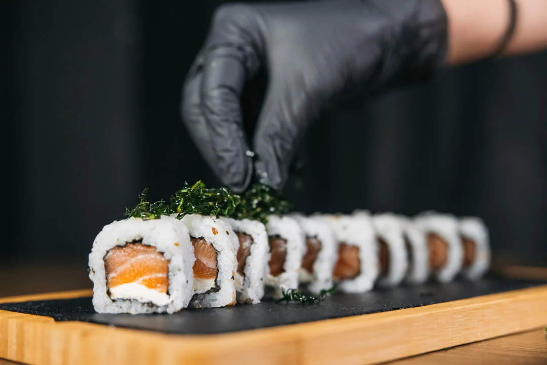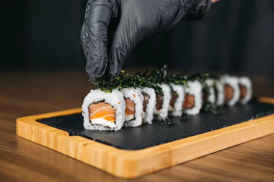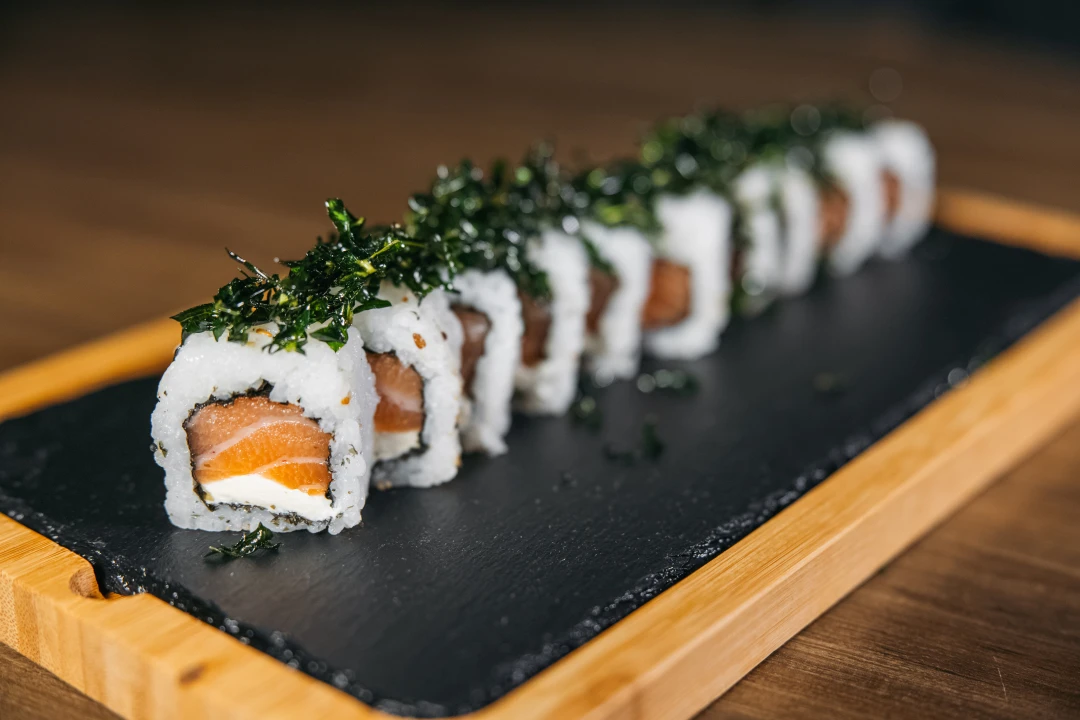 Envolto de alga e arroz premium finalizado com gergelim por fora.