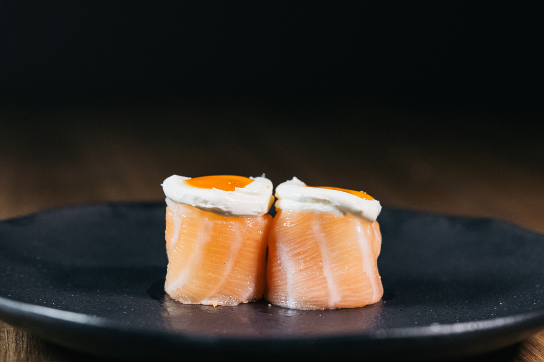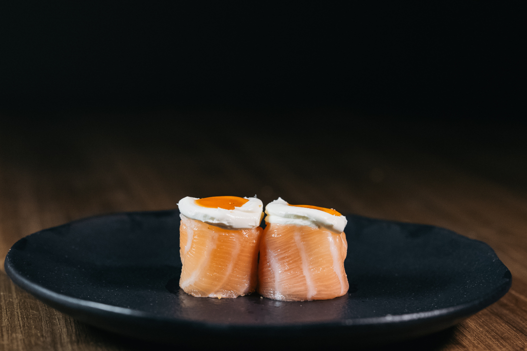 Gunkan é um envolto por uma lâmina de salmão cobertos por cream cheese e este acompanha nossa geléia de pimenta no topo.