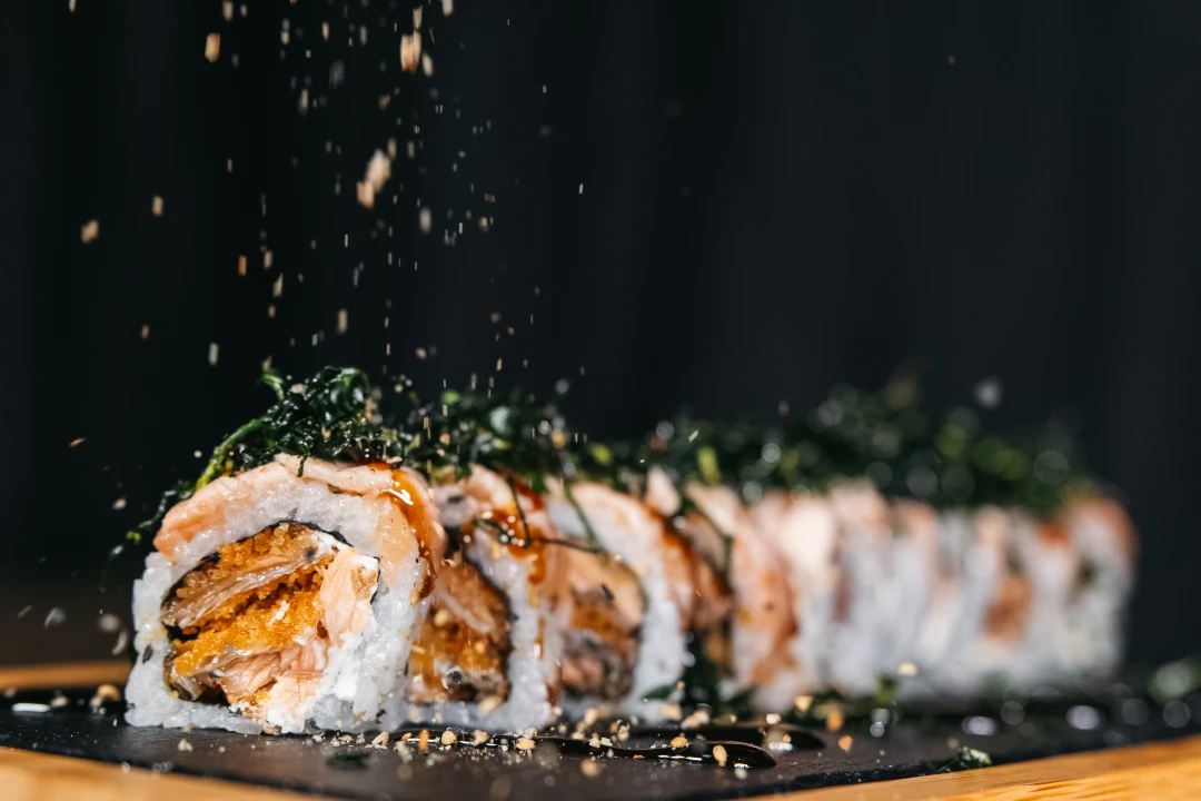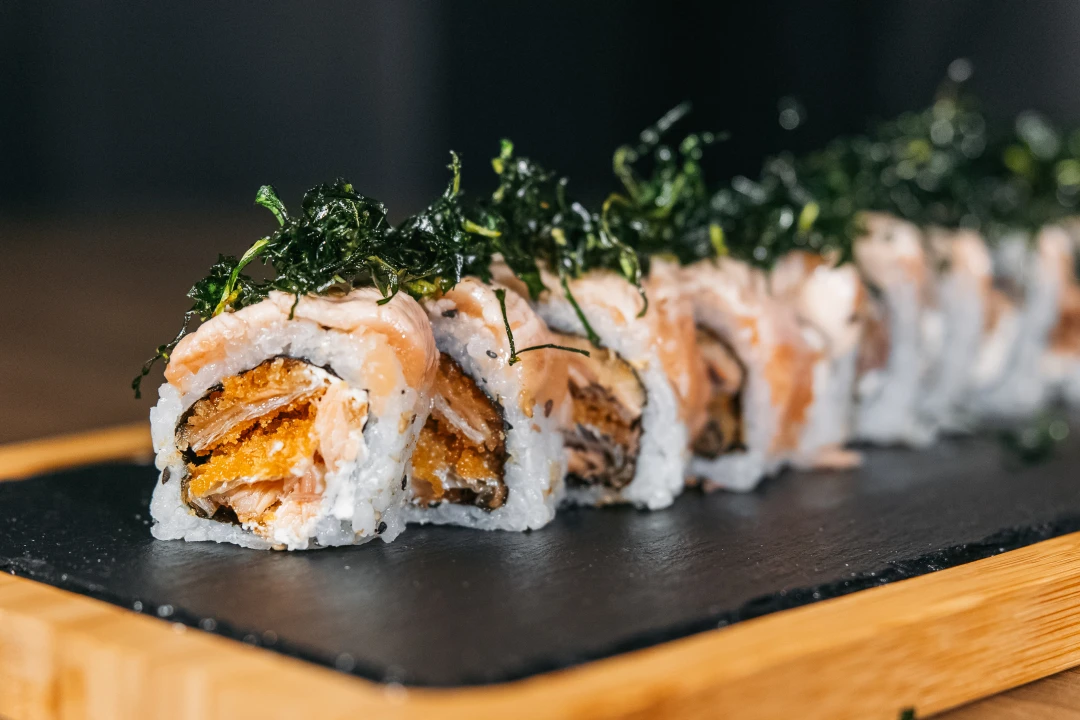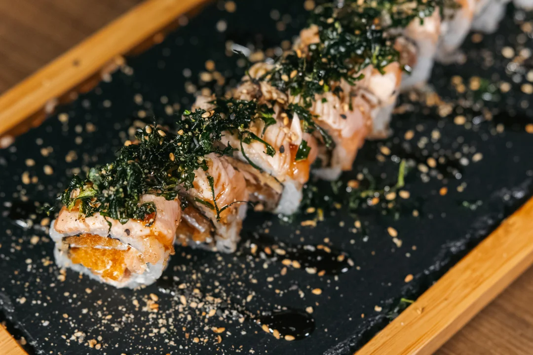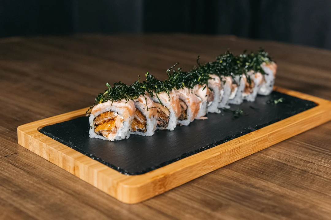 Pele crocante do salmão cominada com o salmão maçaricado, viram um espetáculo em forma de sushi. Enrolado de arroz com recheio de skin empanada super crocante e cream cheese, coberto por uma lâmina de salmão maçaricado, dando um suave gosto de defumado. Finalizado com um toque de molho tarê, gergelim moído e couve crispy.