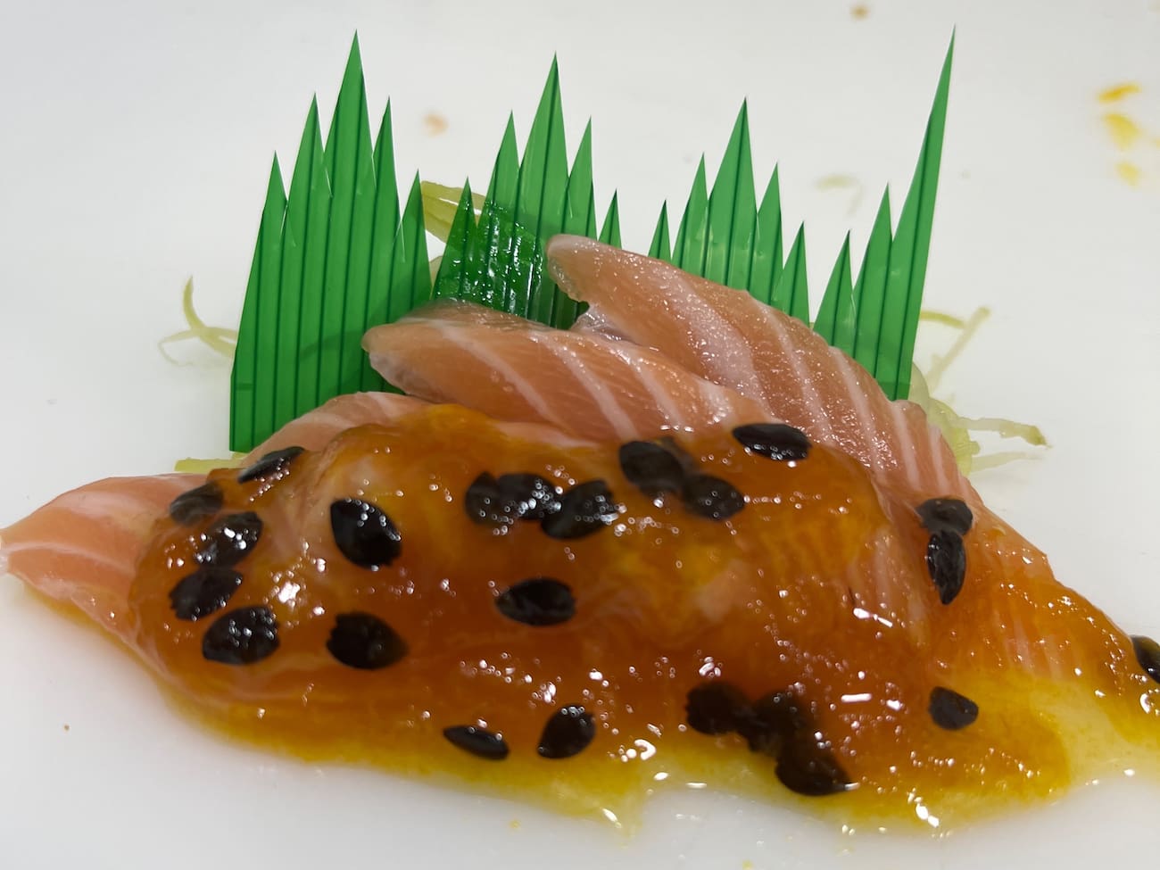 5 Lâminas de salmão finalizadas com geléia de pimenta. Enviaremos wasabi e gengibre, 2 sashês de shoyu e 2 hashi. Aproveite e peça agora mesmo esta iguaria da culinária japonesa!
