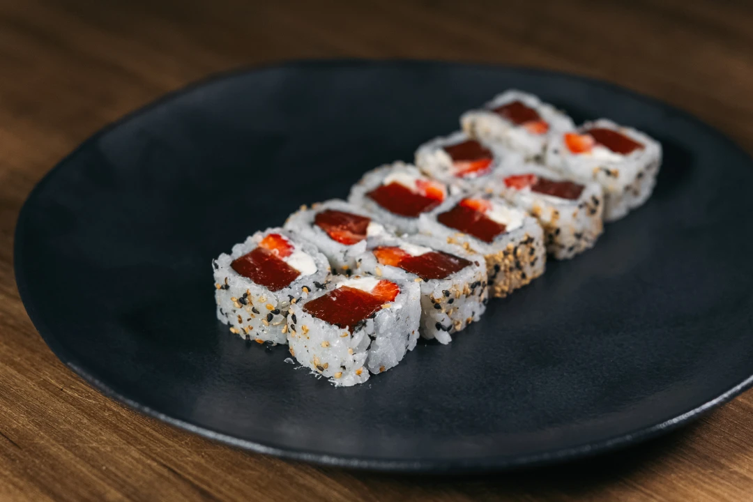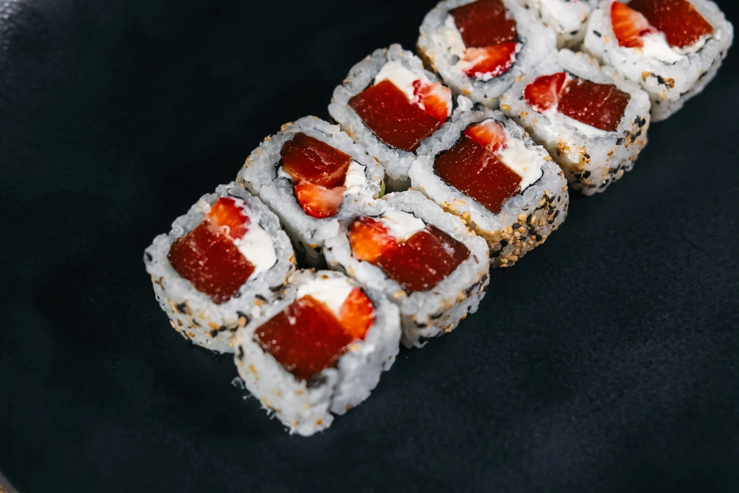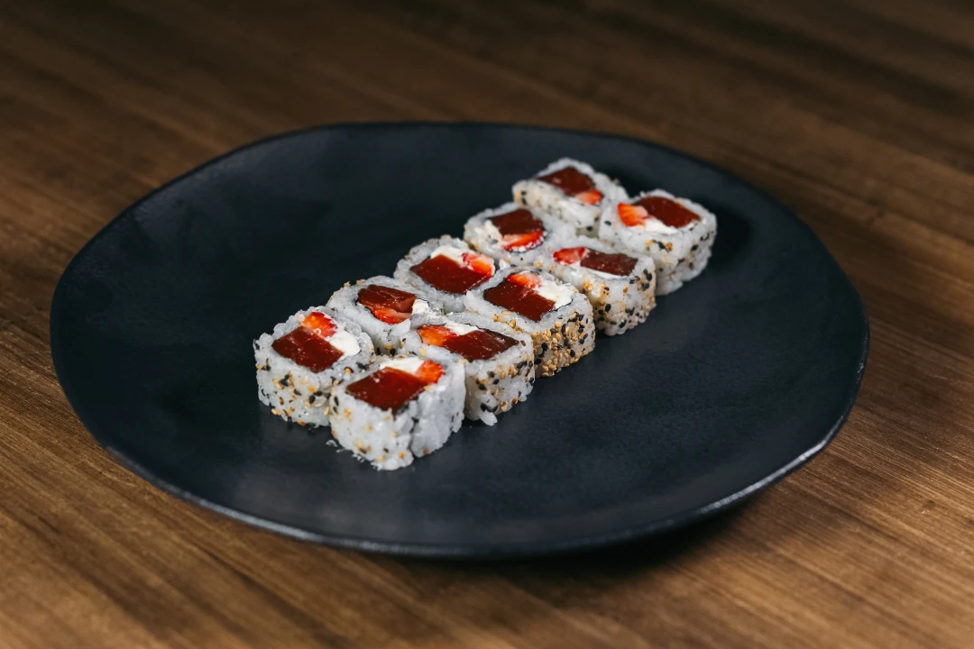 Morango, Goiabada e Cream cheese. Envolto de alga e arroz com gergelim por fora. 🎁Este pedido acompanha 2 pares de hashi + 2 sachês de shoyu sem custo adicional. Peça já essas delícias!
